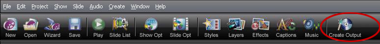 W tym przykładzie pokażę, jak przesłać pokaz na YouTube. Załóżmy, że właśnie skończyliśmy pracę i mamy gotowy pokaz. Klikamy ikonę Create Output (Utwórz plik wyjściowy).